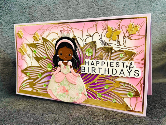 Black Princess with Floral Gown Happiest of Birthdays Large Slimline Card