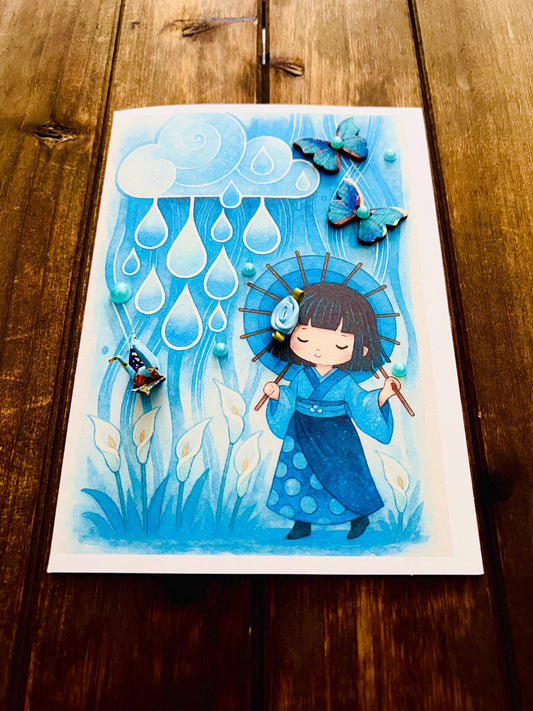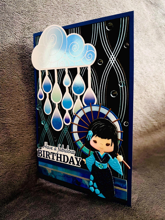 Blue Kimono Girl Birthday Card: Rainy Day Umbrella Design
