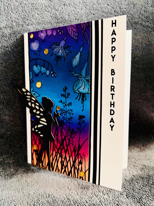 Black Silhouette Fairy Dusk Scene Birthday Card