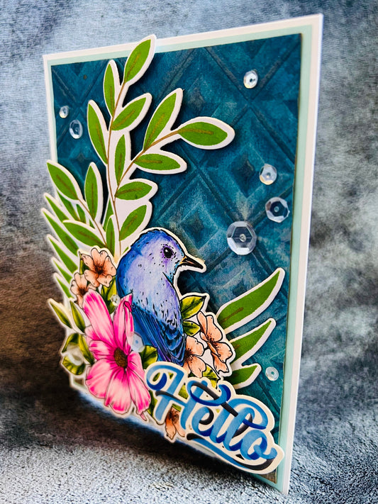 Bluebird Hello Floral Foliage Card - Charming and Whimsical Design for Any Occasion