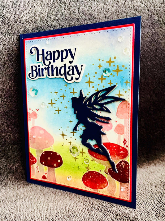 Blue Silhouette Fairy with Gold Pixie Dust Mushroom Scene Birthday Card