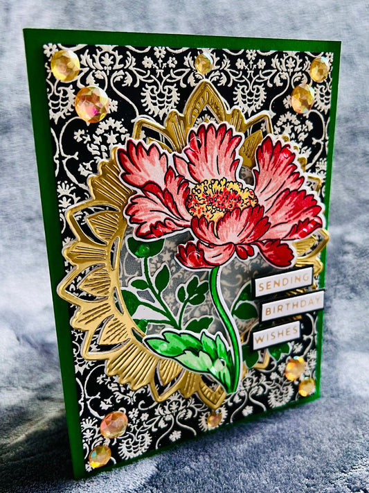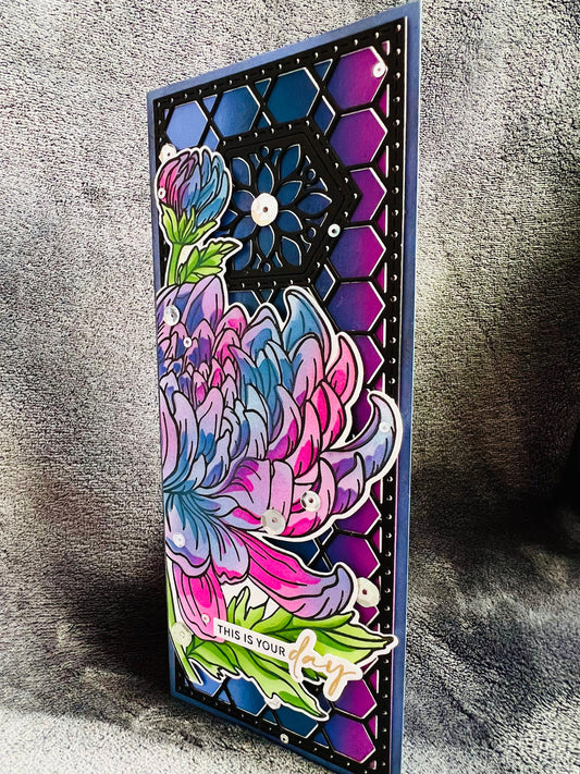 Chrysanthemum Card: Floral Hexagon Grid, Sequin Accents