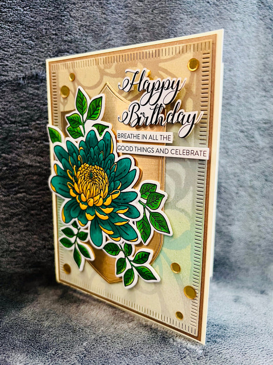 Chrysanthemum Birthday Card: Teal and Yellow Flower, Gold Accents