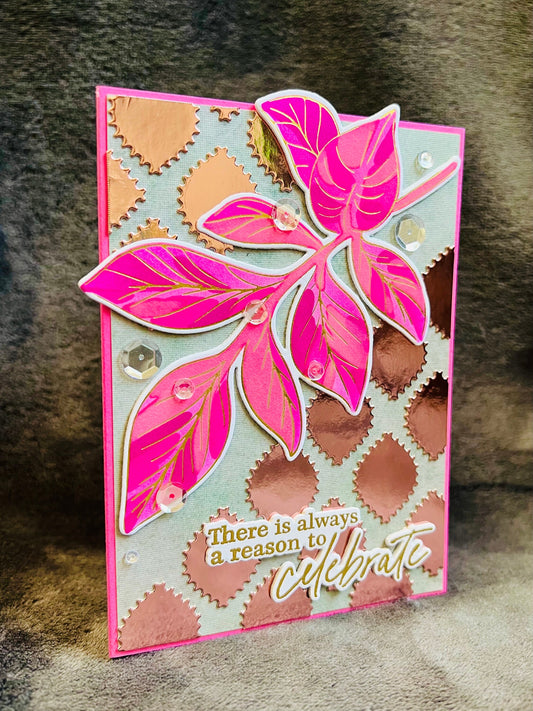 Gold Foiled Celebrate Card: Pink Leaves, Sequin Accents