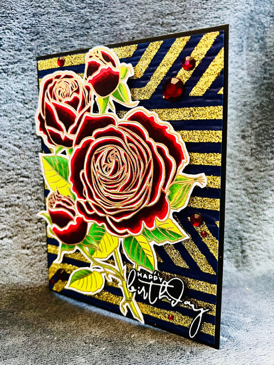 Red Roses Gold Glitter Birthday Card: Embossed Handmade Greeting