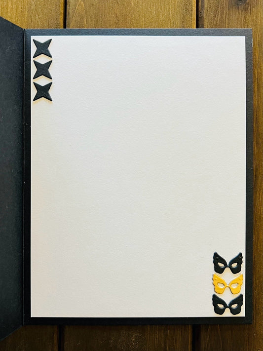 Gold Scrollwork Masquerade Mask Birthday Card - Silver Stars, Elegant and Festive Design