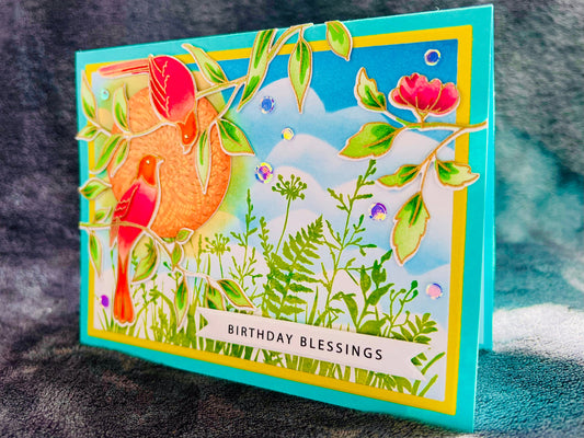Songbird Birthday Card: Gold Embossed Spring Greenery
