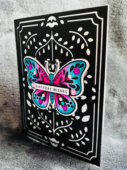Folk Art Butterfly Birthday Card: Hand-Colored Gem Embellished