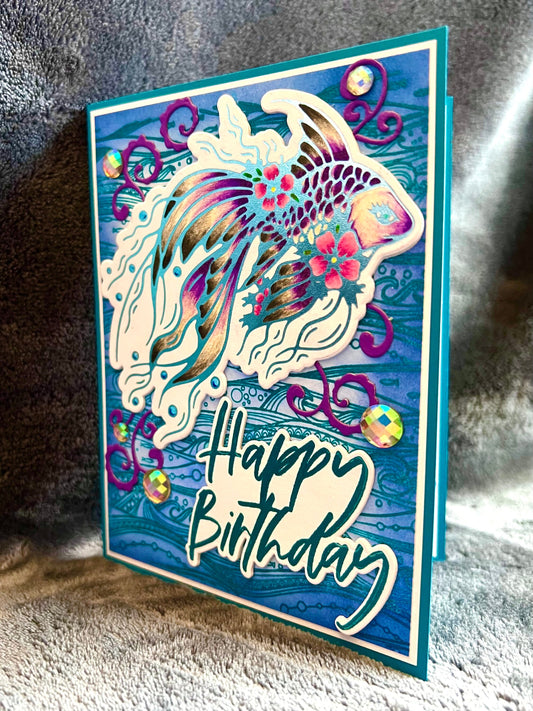 Betta Fish Birthday Card: Embossed Wave, Gem Accents