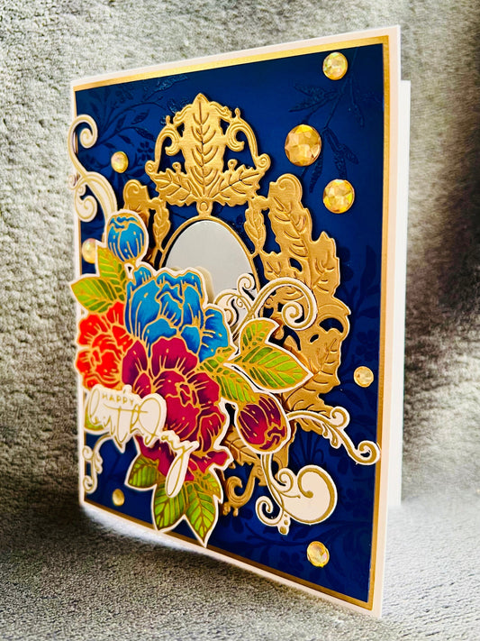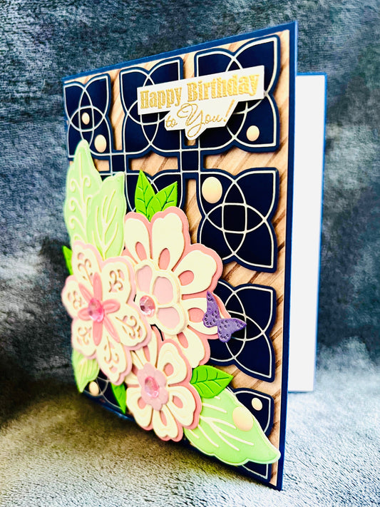 Ornate Florals on Navy Geometric Foiled Background Birthday Card, Elegant Design for a Sophisticated Celebration