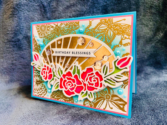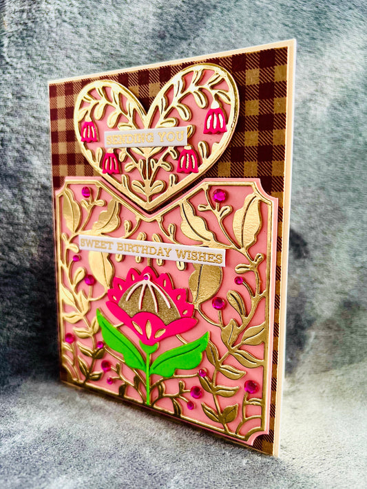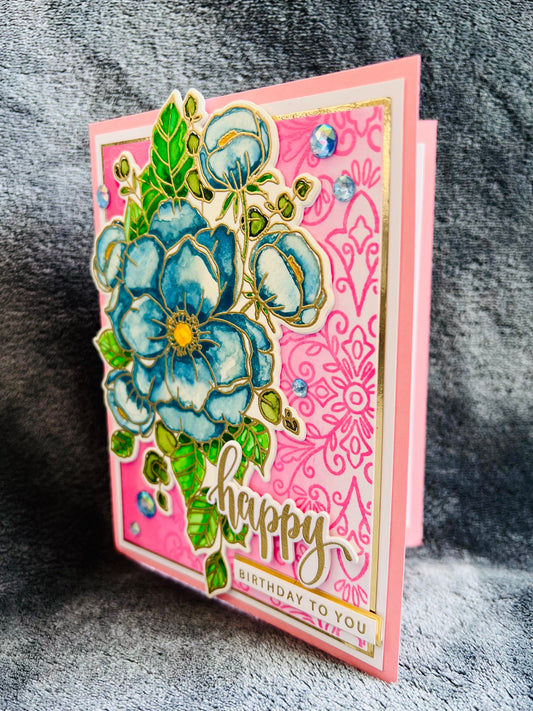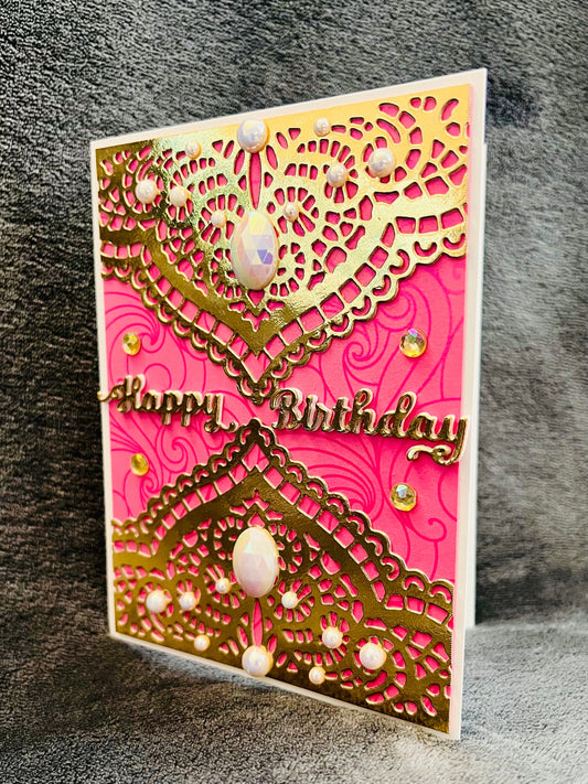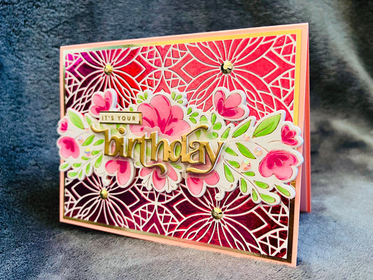 Pink Floral Birthday Card: Gold Foil Gem Accents