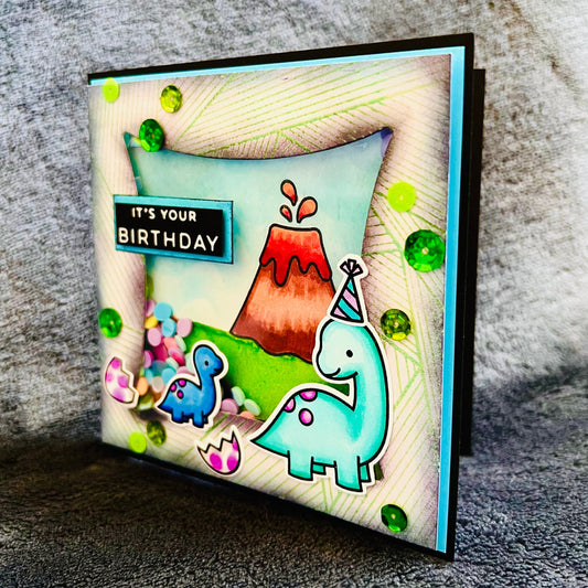 Dinosaurs and Volcano Background Shaker Birthday Card, Exciting Prehistoric Adventure Theme for a Fun Celebration