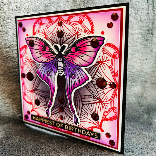 Lavender-Pink Moth Red Bejeweled Mandala Birthday Card, Exquisite Handmade Greeting for Special Occasions
