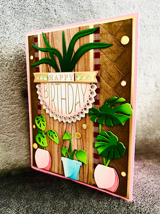 Potted Houseplants and Wood Panel Background Birthday Card