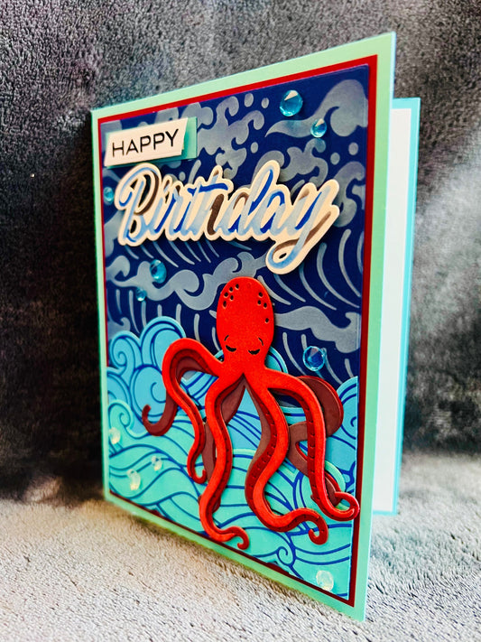 Red Octopus Wave Background Birthday Card, Striking Nautical Theme for an Adventurous Birthday Celebration