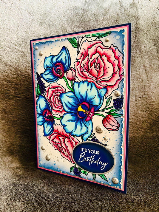 Blue Orchid & Pink Rose Birthday Card: Floral Art Celebration