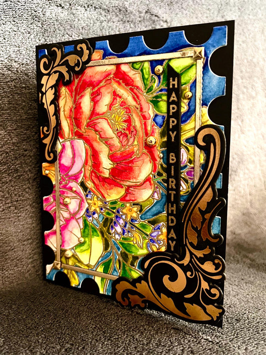 Radiant Oval Stained Glass Rose Birthday Blessings Card - A Luminescent Wish for Your Special Day