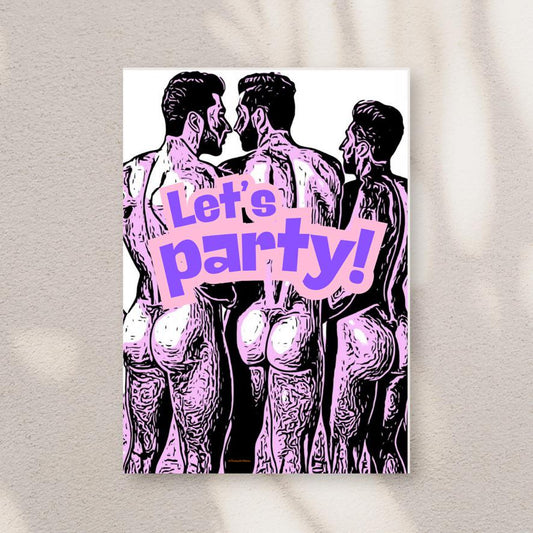 Mature Greeting Card | Let’s Party Nude Male Art Print | Funny Gay Birthday or Celebration Card | Single, 5-Pack, 10-Pack Options