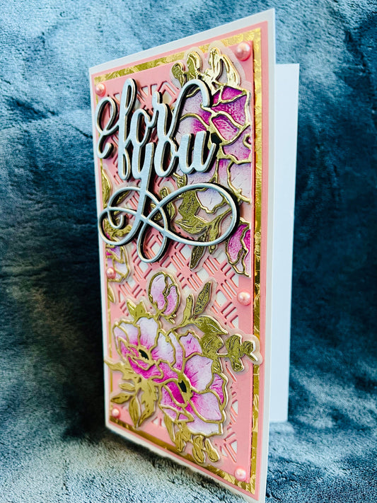 Pink Anemone Card: Gold Outline, Silver 'For You' Sentiment