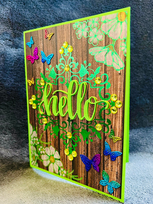 Hello Card: Wood Grain, Rainbow Foil Butterflies, Green Floral