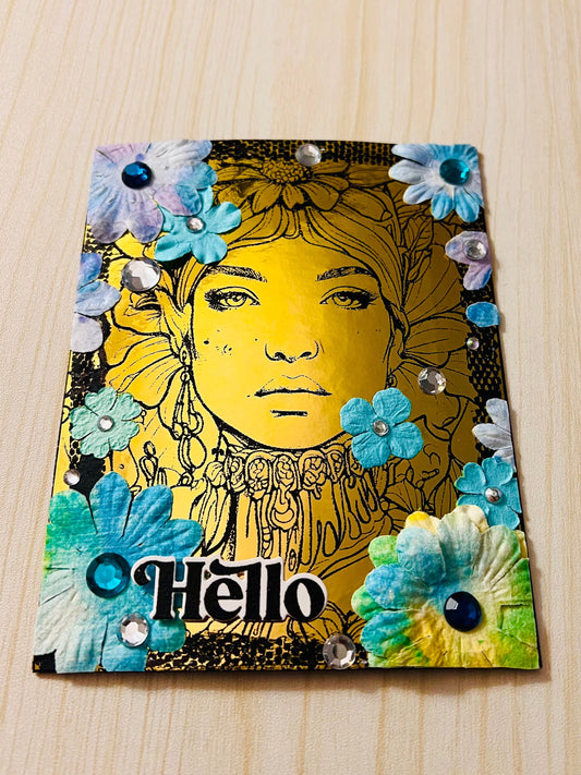 Gold Foiled Lady Hello Card: Floral Headdress, Blue Paper Flowers