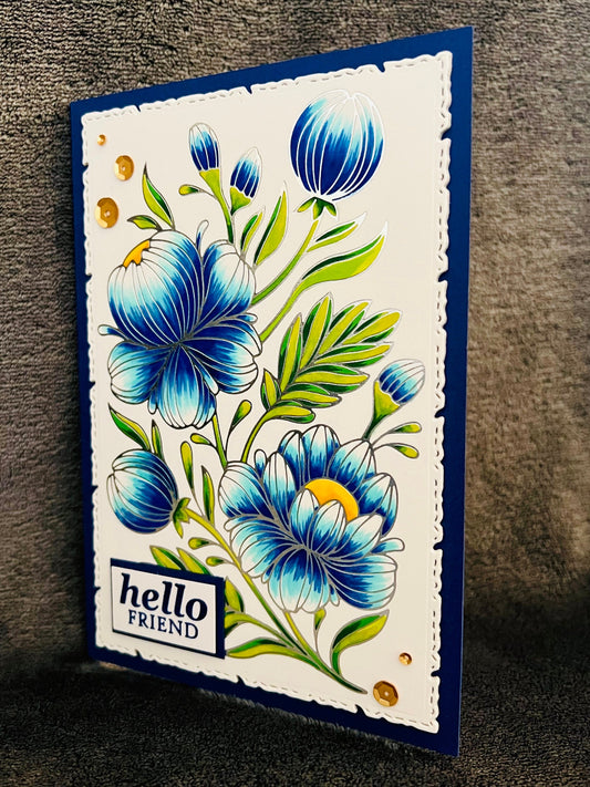 Silver Outlined Blue Floral "Hello Friend" Card