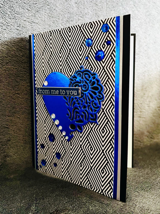 Filigree Heart Card: Metallic Blue Gem Accents, Diamond Illusion