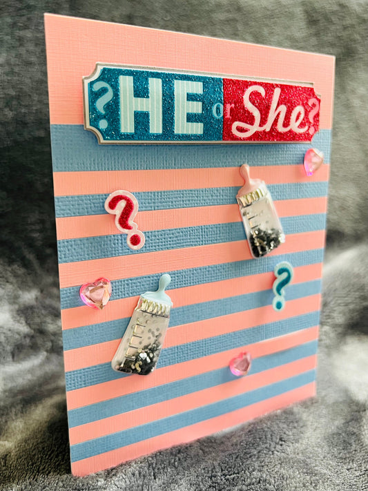 Striped Baby Gender Reveal Card: Confetti Bottle Accents