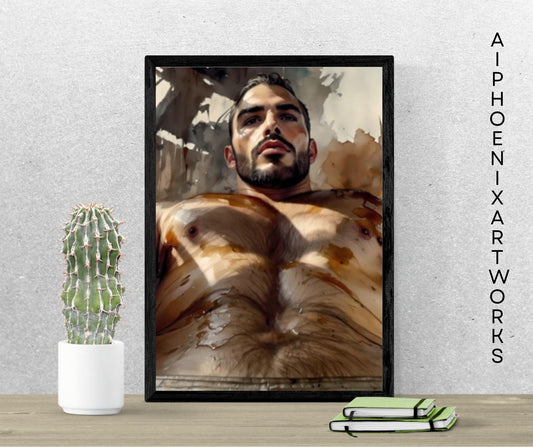 Sensual Bearded Man Watercolor Print: Erotic Male Torso Portrait (Digital Download)