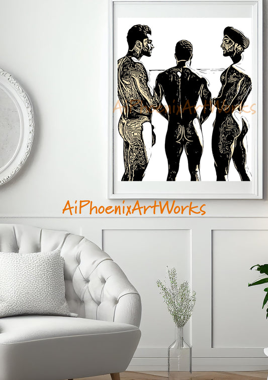 NSFW Erotic Line Art Print | Gay Male Nude Trio | Modern Black & White Wall Art | 3 Sizes Available
