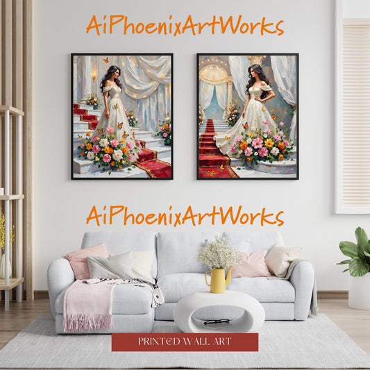 Floral Gown Art Prints: Garden Staircase Fairytale Fashion - Set of 2