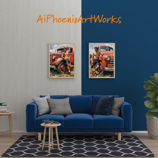 Retro Truck Cowboy Set | 2 Art PRINTS | Rustic Muscle Decor | Vintage Americana Wall Art