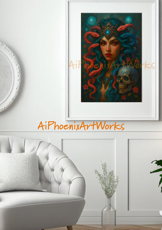 Medusa Fantasy Art Print | Dark Mythology Wall Decor | Gothic Snake Goddess Illustration | AiPhoenixArtWorks