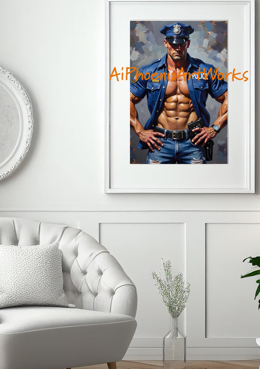 Sexy Policeman Wall Art PRINT | Male Pin-Up Painting, Modern Gay Art Decor | AiPhoenixArtWorks